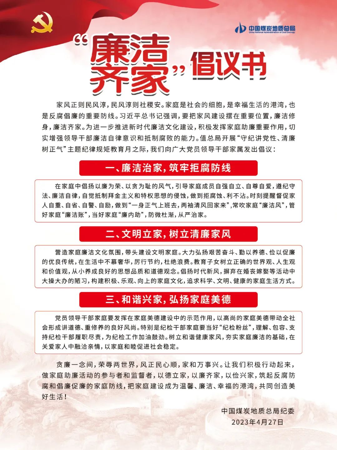 中国煤炭地质总局|“廉洁齐家”倡议书